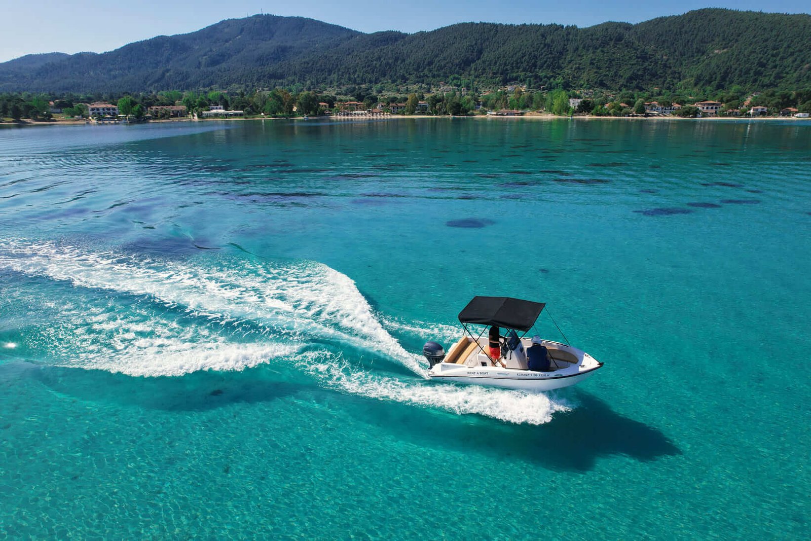 Explorer Boat Rental Sithonia Halkidiki is perfect for couples and small groups eager to explore the crystal-clear waters of Diaporos Island and beyond.